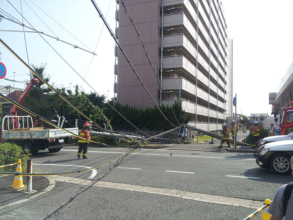 この通り、電柱が倒れて、近隣は一帯、停電になってしまい、事務所が蒸し風呂の様に、暑くなってしまった事を記憶しています。