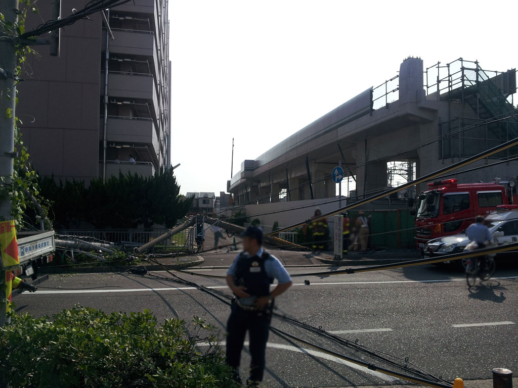 電柱が倒れたので、火事にならないかという事で、消防車まで来ていて、野次馬もいたのですが、何よりも、国道43号線を走っている車は、瀬戸の交差点から、右折、左折して、十二軒道路に入る事が出来なくなっていたので、瀬戸の交差点辺りは、大渋滞が起こっていて、東灘区の様に、大都会ではない、比較的、閑静な住宅街でも、一本、十二軒道路の様な幹線道路が通行止めになったり、横屋東踏切の様な、交通量がそこそこ多い踏切が通行止めになる事によって、大変な被害が発生するのだと、再認識させられました。