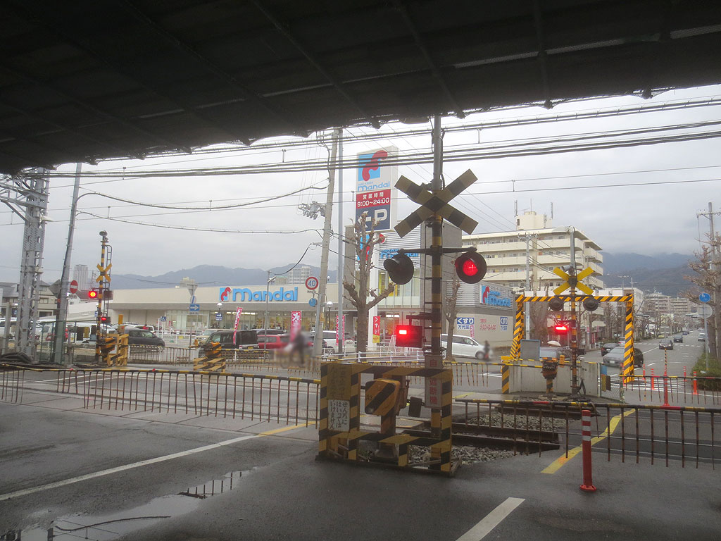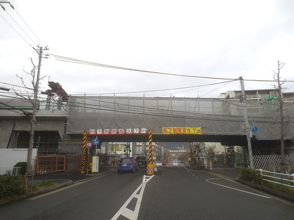 これは、南側から阪神電車の踏切を見た様子ですが、天気が悪いという事もありますが、美しい東灘区の山並みの景色は、しっかりと高架で遮られてしまいましたね。
