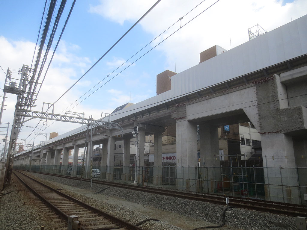 この写真は、駅から東方面を向いて撮った写真ですが、完成した高架が、ずっと向うまで繋がっていますね。