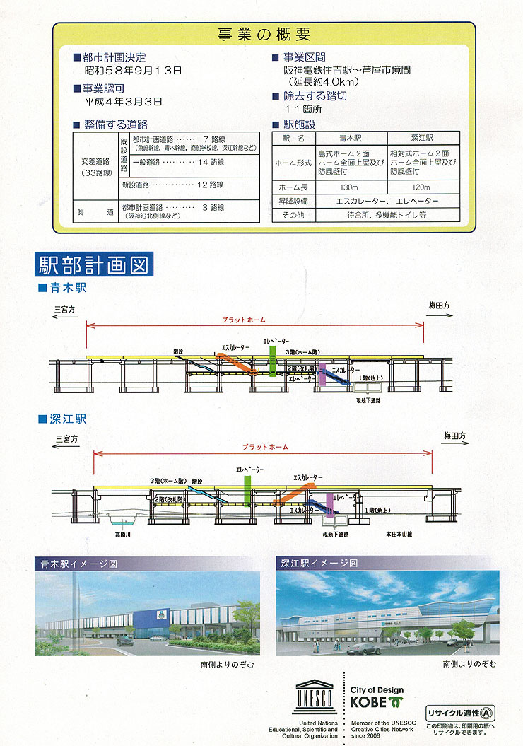 これは、近隣の住居に配布されていた「駅部計画図」なのですが、この駅舎の計画図を見てみると、2階部分に改札口が出来て、プラットホームは3階に出来る感じなのですが、2階から3階へは、エスカレーターやエレベーターと共に、階段も設置される様に書いてあるのですが、1階から2階へは階段は書かれていないので、この写真の階段は、下り線が高架化になった時の為だけの階段なのかも知れませんね。