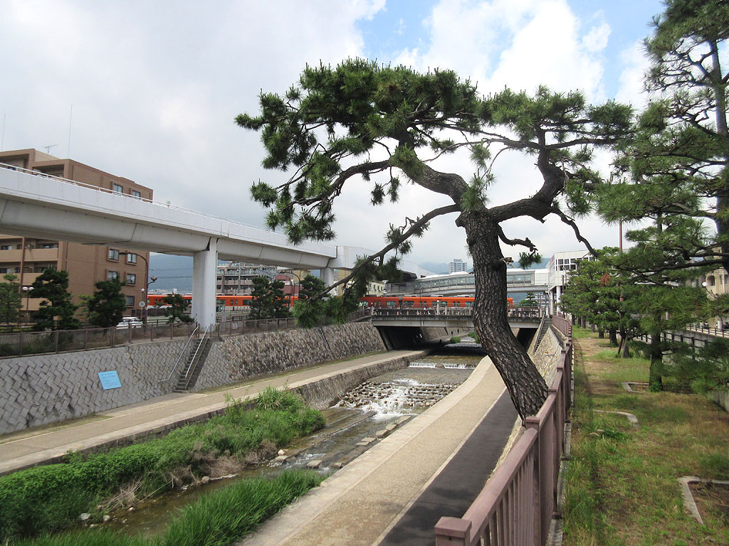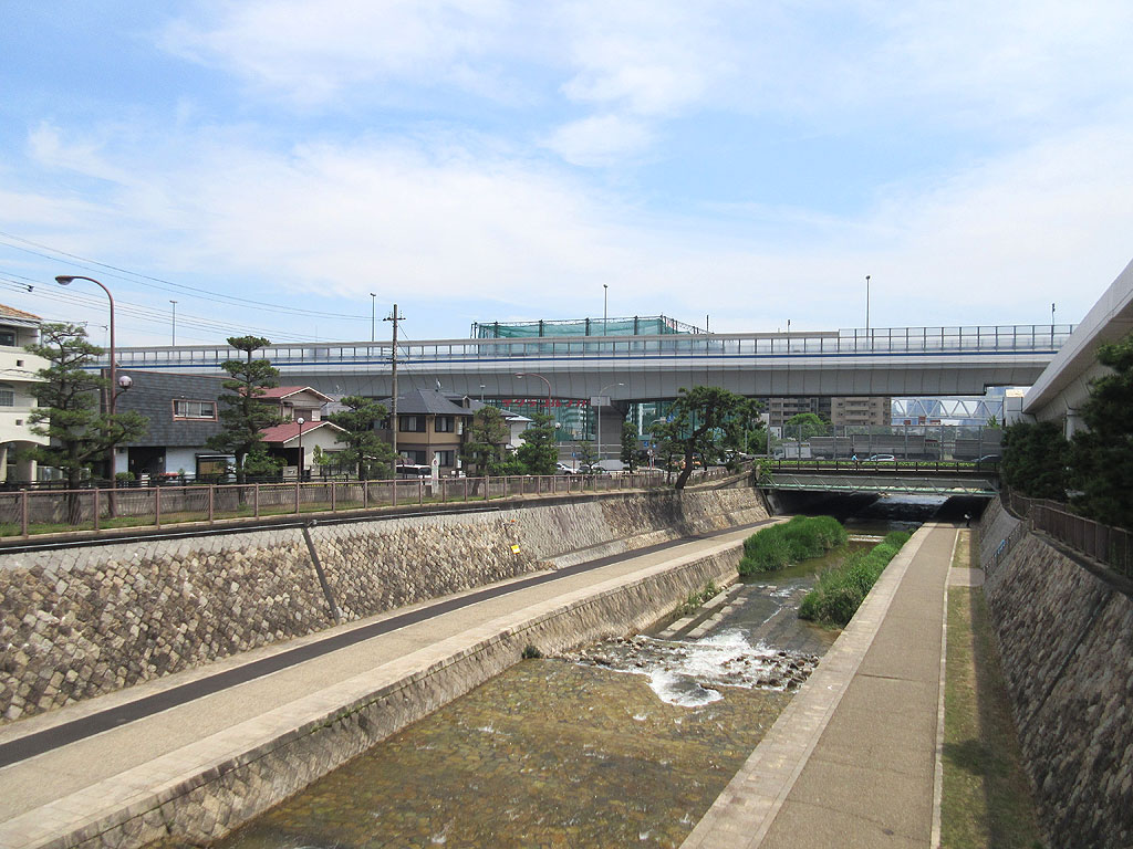 ここは、東灘区の住吉川ですが、阪神電車と国道43号線の間の住吉川を、国道43号線側から北に向けて撮った写真です。