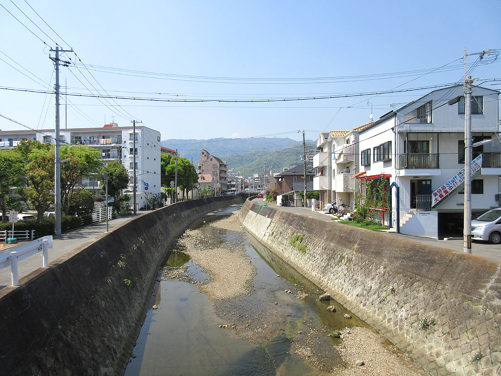 ここは、東灘区の東部を流れる天井川の写真…、阪神電車の北側の線路沿いに掛かっている橋の上から、山側に向かって写真を撮りました。