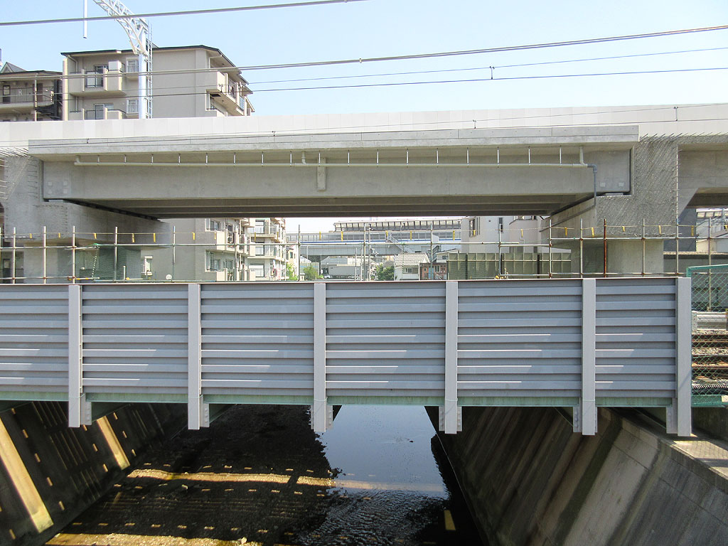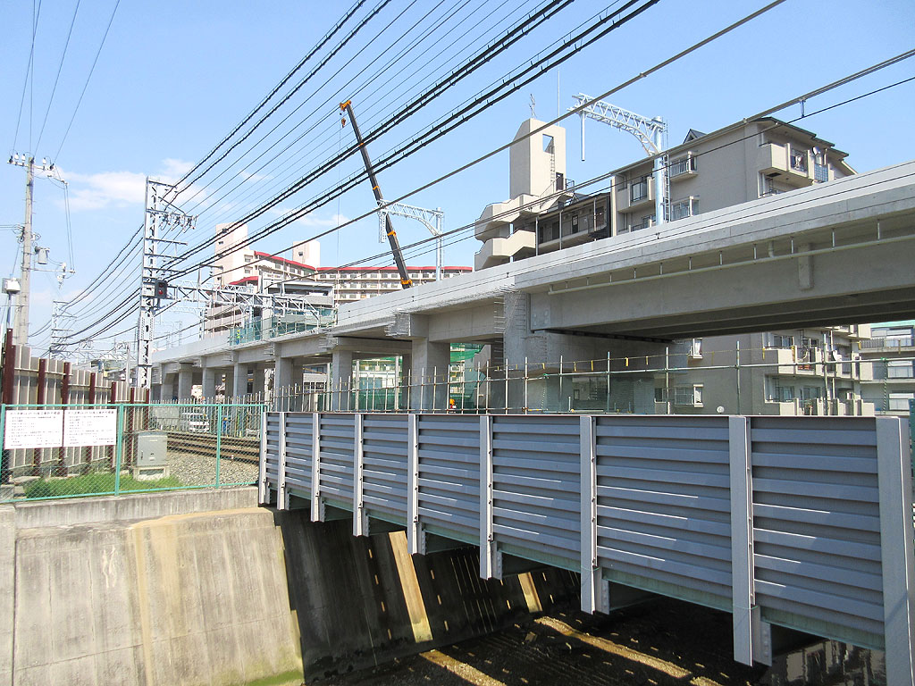 建築中の阪神電車の高架の向こう側の右に建っているマンションは、甲南シャトー青木というマンションなのですが、何年か前に、ちょうど高架と同じ位の目線の階のお部屋が売りに出ていたと思うのですが、高架が出来てしまって、開放感がなくなってしまったかも知れませんね。