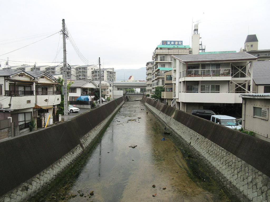 そして、夕方になって、ようやく雨が降って来ましたので、ドシャ降りではなかったのが残念でしたが、再度、東灘区の天井川の写真を撮りに行きました。
