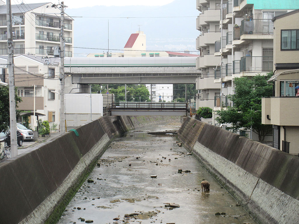 猪がここまで下りて来れるのは、やはり、天井川の水位が低いからだと思いますが、熊本の方では27万人もの方々が避難をしなければいけない程の大雨が降っておりますのに、この東灘区は梅雨の時期だというのに、降水量も少ないですし、天井川も溢れそうな様子もありませんし、とっても有難い事なのです。