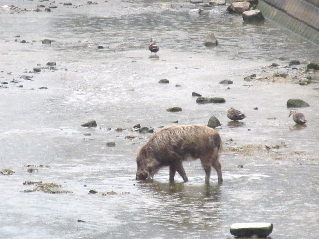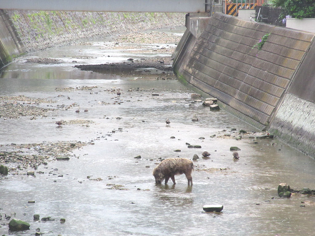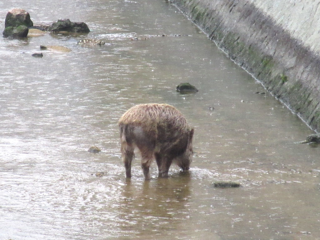 「水位も全然、上がっていないなぁー」なんて思いながら、天井川の流れを見ていましたら、なんと、岡本の方ではよく出没をする猪くんがいたのです。