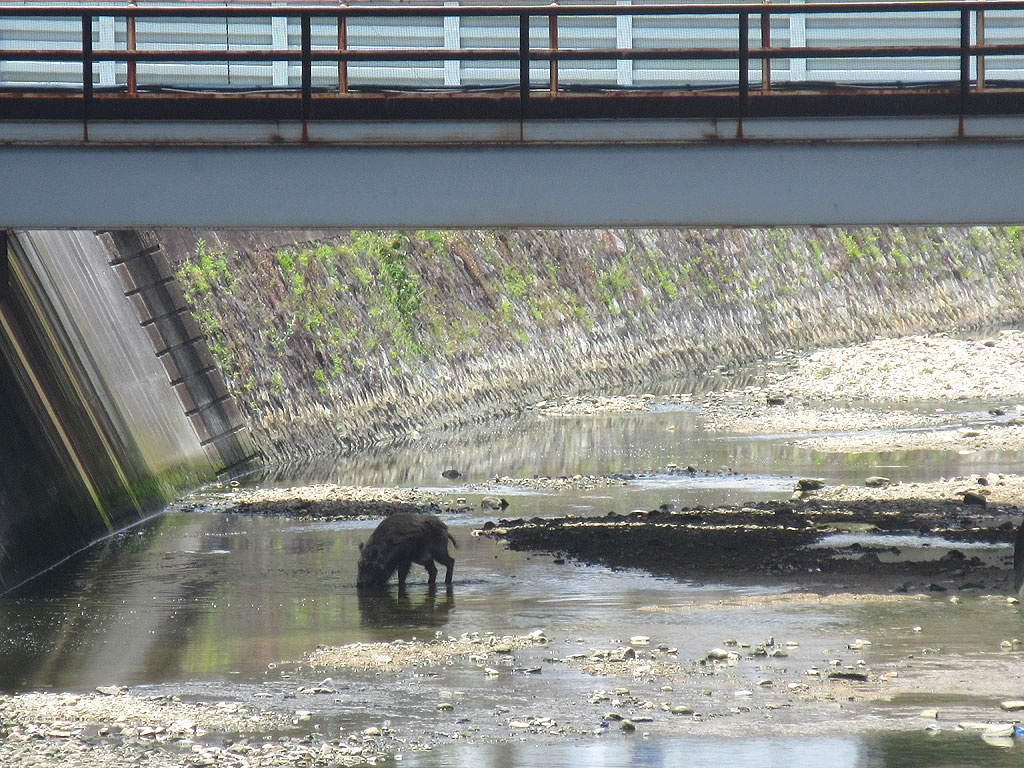 この写真では、猪がどこにいるのか分かりにくいのですが、ちょうど阪神電車の線路の高架の下で、水に口を付けて餌をあさっていたのです。
