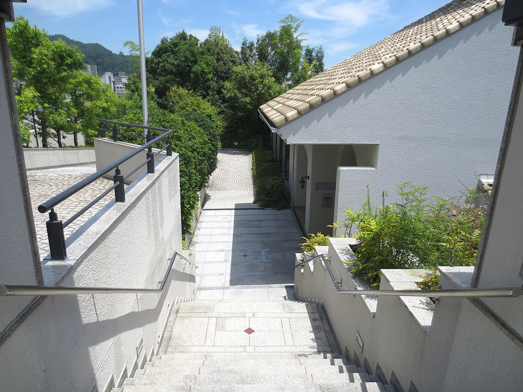 坂のある町のマンション。この東灘区の鴨子ヶ原の辺りは、坂が急な所で、、その分、海を望む眺望の取れるマンションも多いのですが、このマンションは、急な傾斜地に建てられたマンションになりますので、写真は北側のエントランスになりますが、このエントランスは6階部分になる様な(このマンションは7階建て)、まさに傾斜地に建てられたマンションになります。